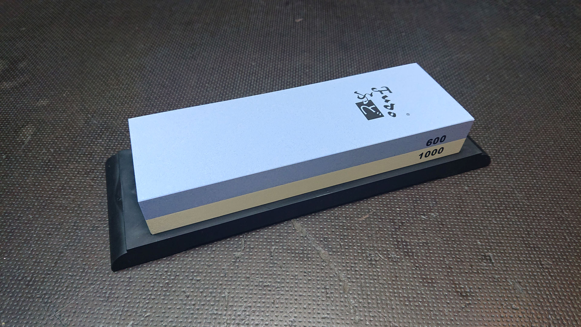 Kombi-Abziehstein auf rutschfestem Gummisockel.